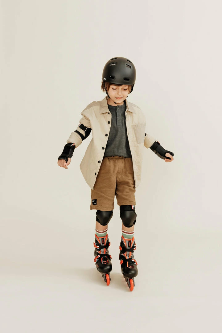 We recommend all of them: helmet, elbow pads, knee pads, and wrist guards. Because you never know which part of your body you’re going to land on.