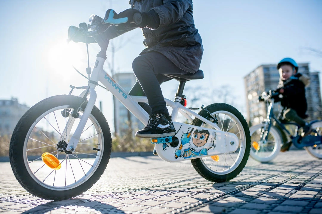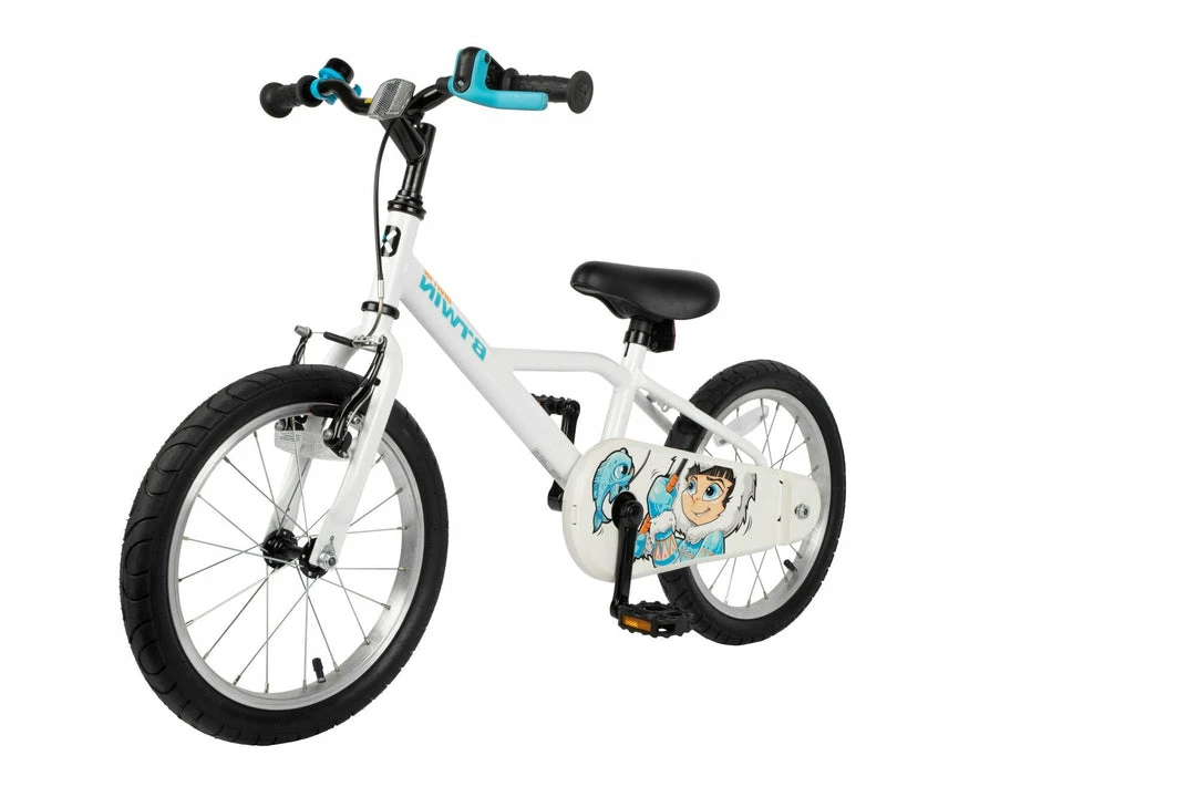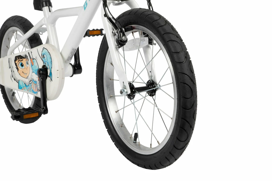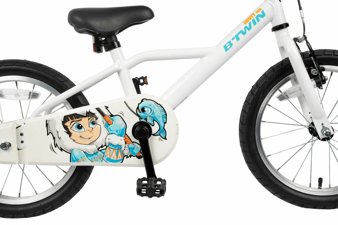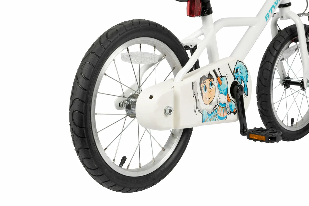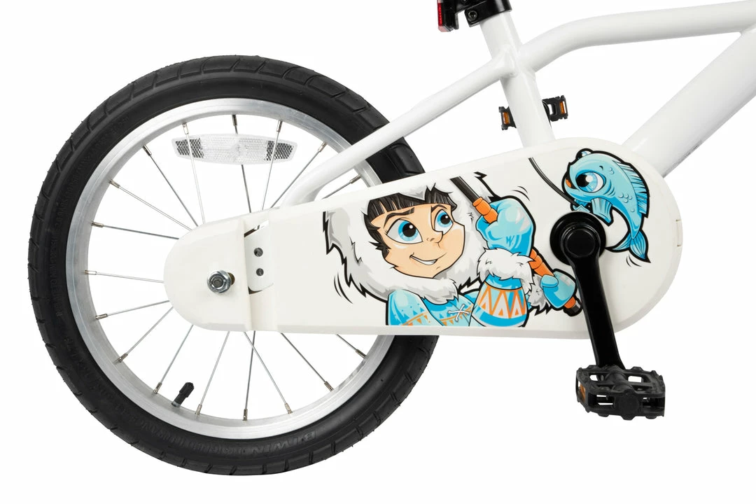 A simple 16″ bike for kids aged 4 to 6, with a simple chain guard, reflectors, and a bell.