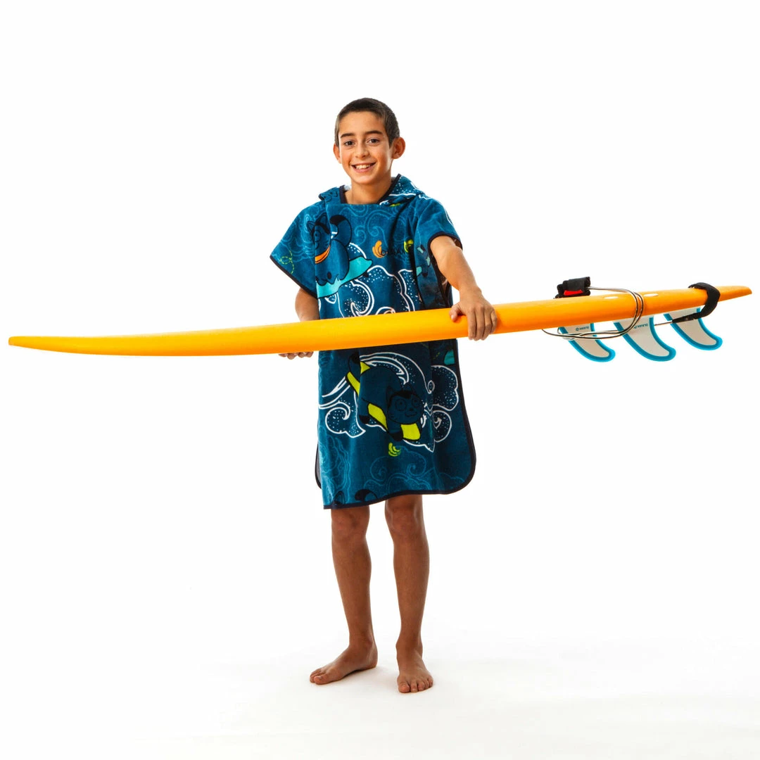 Our designers have developed this poncho for young surfers 3’7″ to 4’5″ tall, for drying off and getting changed before and after their sessions.