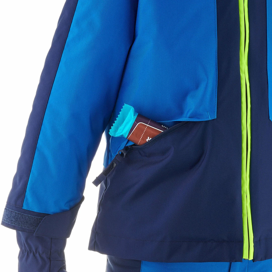 Warm ski jacket and pants, waterproof and adjustable in length (sleeves/legs). Mittens, and the possibility of combining the 3 garments to protect kids from the cold and stop snow from getting in.